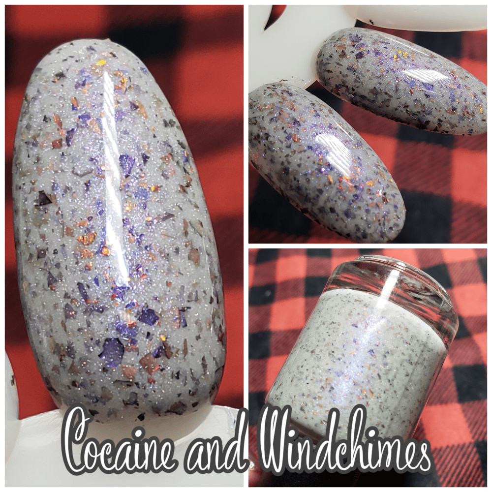 Cocaine and Windchimes 2.0 is a light gray crelly with green to pink and blue to purple shifting flakies and purple shimmer. It is a 2.0 version of the one batch wonder pictured here.